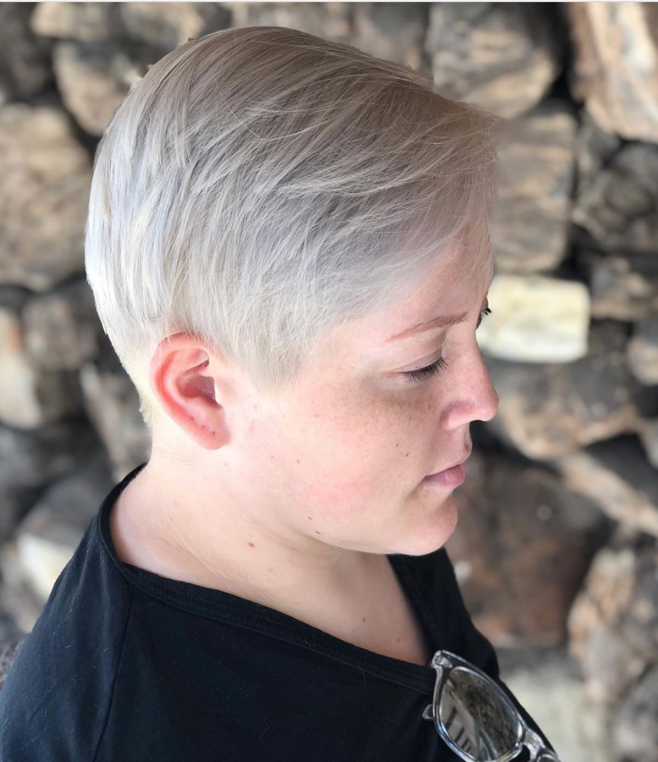 El cabello rubio helado para este corte hace que el cabello corto cobre vida. El cabello barrido agrega estilo, pero es el color lo que realmente lo hace resaltar.