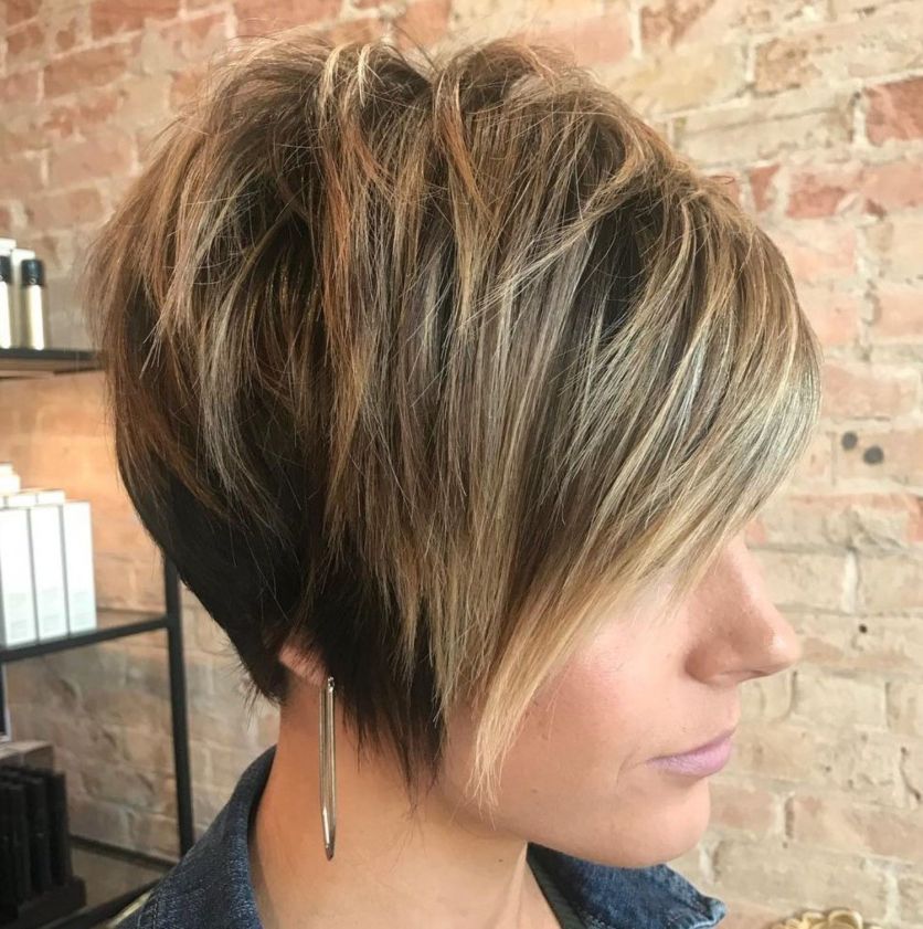 Una forma de enfatizar las capas en tu peinado corto es agregar algunos reflejos. Los aspectos más destacados de este corte de pelo acentúan el corte pixie bob redondeado tan bien que parece darle más volumen.