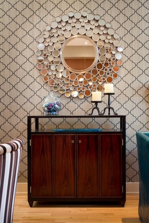 Este magnífico espejo fue elaborado con tubos PVC. La tubería fue cortada, pintada y pegada alrededor del espejo.