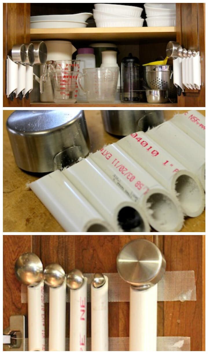 Este proyecto usa piezas más pequeñas de una tubería de PVC. Corta algunos trozos de tubería y usa velcro para adherirlo al interior de tus gabinetes para mayor comodidad.