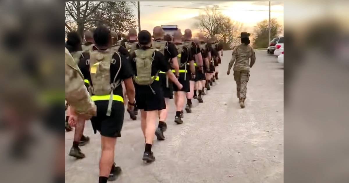 …at first. When the video begins, you see a group of soldiers wearing backpacks. More than likely, they’re going on an intense training mission as part of basic training. You hear them chant while marching in response to calls made by their drill sergeant.